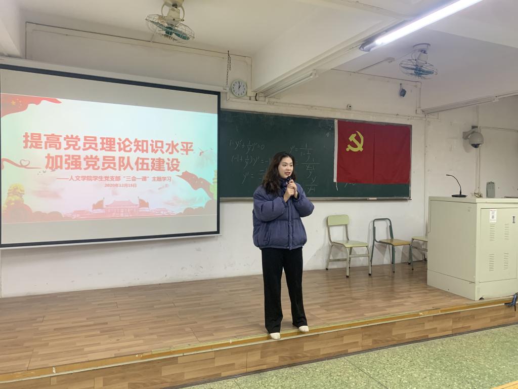 为深入贯彻落实党的十九届五中全会精神,提高党员知识理论水平,严抓公司党员队伍建设,人文公司员工党支部12月15日于人文艺术楼205阶梯课室开展“三会一课”主题学习,全体入党积极分子参加,员工党支部书记徐可欣主持本次活动。