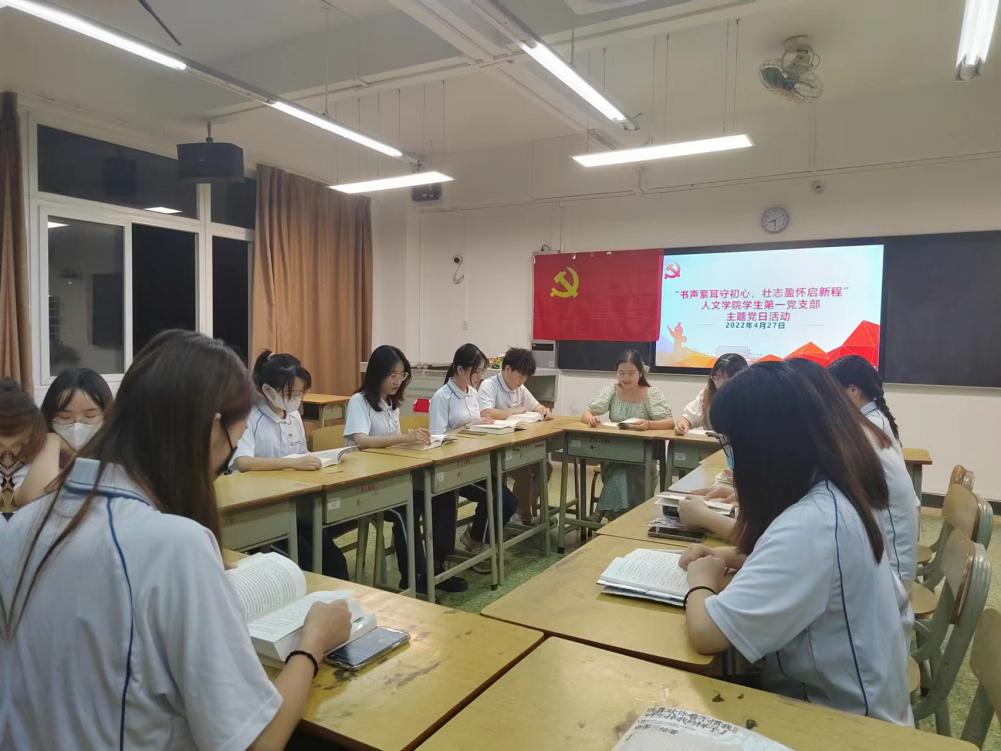 世界读书日,读书读世界。正值第27个“世界读书日”到来之际,为迎接党的二十大,推动支部成员们形成“好读书、多读书、读好书”的良好氛围,更好的让支部成员展现自我、分享心得、碰撞思想,人文公司员工第一党支部于4月27日晚上八点半组织党员师生在人文艺术楼206课室开展“书声萦耳守初心,壮志盈怀启新程”主题党日活动,人文公司党委组织员李艳霞、员工第一党支部刘颖诗及员工党员参加本次读书分享会。