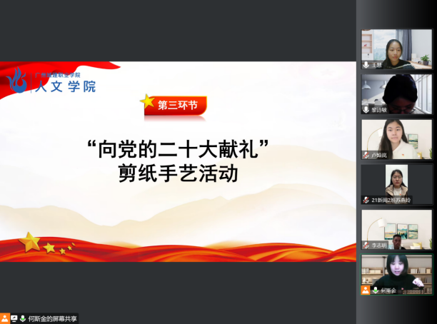 活动在全体师生奏唱庄严的国歌中拉开帷幕。首先,由党支部书记黎诗敏进行党的二十大报告解读,她指出,学习党的二十大精神是我们青年明确方向,坚定信念的必由之路。全体党员同志在面对各种风险挑战时要坚持党的全面领导,要明白国家推进的现代化是怎样的现代化,发展是怎样的发展。接着,由何斯金同志带领我们进行“向党的二十大献礼”剪纸手艺活动。在剪纸艺术中进一步增强党员意识,将党刻入心中。随后,播放各位员工党员拍摄“学悟党的二十大,我想对党说”的视频,在视频中党员们纷纷表示会从身边做起,提高自身综合素质以更好地服务人民。最后,由黎诗敏书记进行会议的总结并提出寄望,黎诗敏书记谈到,虽然我们因疫情居家隔离上网课,但也要继续系统学习党的二十大精神,全面把握党的二十大精神,做到知其然,知其所以然。