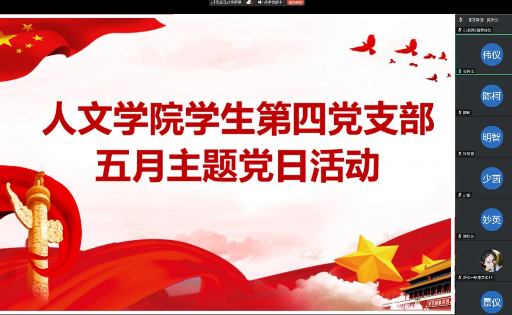 为聚焦毕业生党员的思想政治教育,提升员工党员党性修养,5月28日晚,公司员工第四党支部成功举办5月份主题党日活动,活动由党支部书记吴伟仪主持,组织委员高珊、宣传委员郑妙英及全体员工党员线上共同参与。