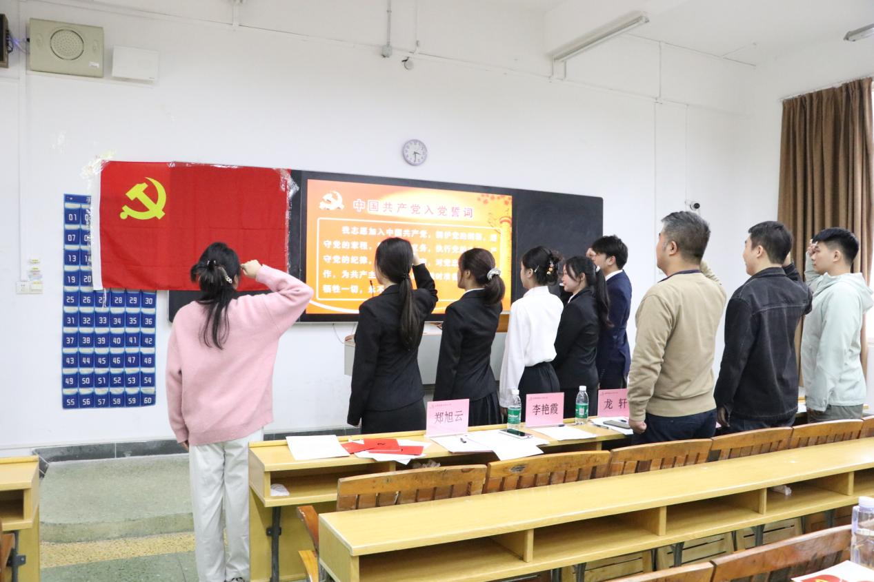 经无记名投票,大会一致同意接收陈智坚等6名同志为中共预备党员。随后,龙轩、李艳霞为预备党员佩戴党员徽章,李艳霞带领全体预备党员进行入党宣誓并给预备党员讲解党徽和党旗的使用规范。