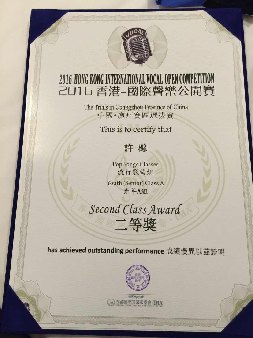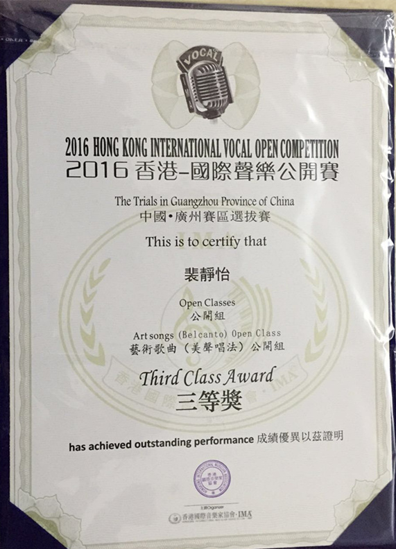 近日,从“2016香港-国际声乐公开赛”组委会获悉,公司人文公司2014级音乐表演专业员工许橼、裴静怡在“2016香港-国际声乐公开赛”香港总决赛中分别获得流行歌曲组三等奖和公开组优秀奖,为公司赢得了荣誉。