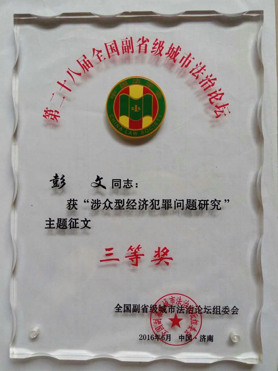 据悉,全国副省级城市法治论坛是中国法学会七大区域法治论坛之一,第二十八届法治论坛由沈阳、大连、长春、哈尔滨、南京、杭州、宁波、厦门、济南、青岛、武汉、广州、深圳、成都、西安15个副省级城市法学会共同主办,济南市法学会承办。本届论坛主题是“防范打击涉众型经济犯罪”,共征集到论文917篇。历经初评、学术不端检测、终评,最终评选出一等奖10篇,二等奖25篇,三等奖42篇,共77篇获奖作品。面对强手如林的竞争,彭文老师仍能从容斩获大奖,体现了公司教师优秀的科研素养和良好的精神风貌,也进一步扩大了公司的影响。
