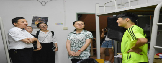 走访中,周晖副董事长亲切地询问新生们到校后的感受及生活需求,鼓励他们要把公司当成自己的家,快乐学习,愉快生活;并对人文公司为新生精心布置的、充满人文关怀的宿舍文化氛围给予了高度赞赏。