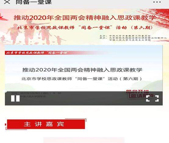 为进一步推进思想政治理论课教学工作,将全国两会精神和疫情防控深度融入思政课堂,丰富教学内容,提升教学效果,5月29日,思政部主任谭德礼组织思政部全体教师线上学习北京市思政教师“同备一堂课”活动(第六期)和由教育部社科司主办、全国高校思想政治理论课教师网络集体备课平台承办的“周末理论大讲堂”。