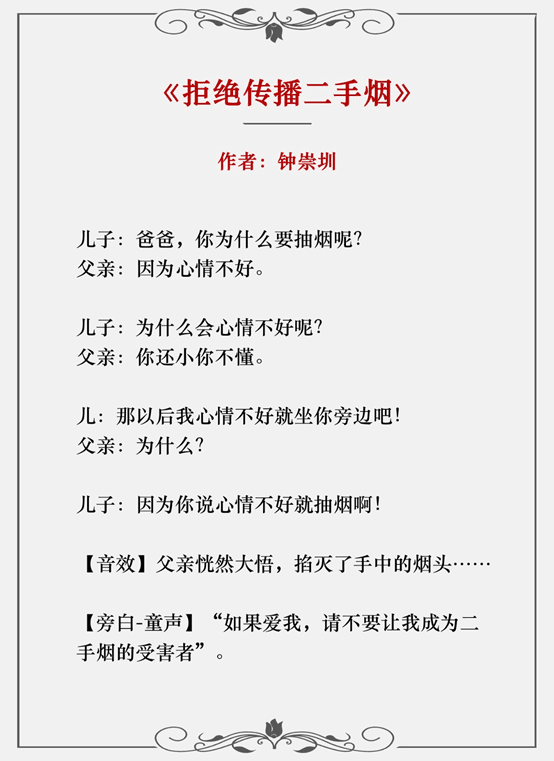 钟崇圳的作品《拒绝传播二手烟》以“二手烟的危害”为主题,关照社会现实:在很多家庭里,父亲都在室内抽烟,危害孩子健康;作者巧妙设计父子之间的对话,整个广播文案短小简洁但意味深远。