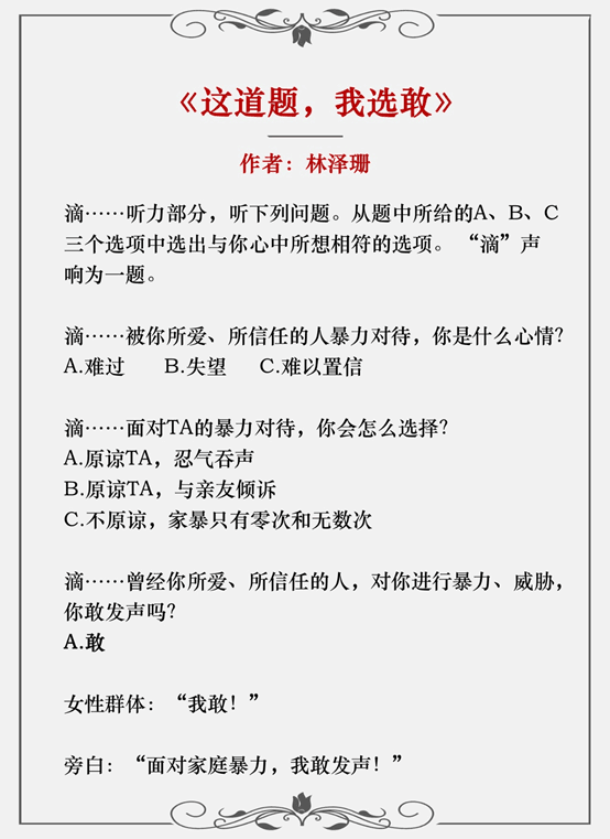 林泽珊的作品《这道题,我选敢》以“家庭暴力”为主题,文案模拟英语听力练习,更具创意性地向社会传播面对暴力要勇敢发声的正能量;面对暴力行为,不要犹豫,告诉全社会的妇女和儿童勇敢选“敢”。整个广播文案创意十足,振聋发聩。