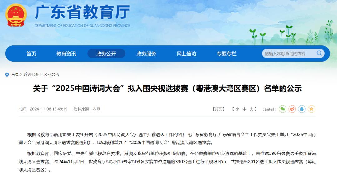 据悉,“2025中国诗词大会”央视选拔赛,广东省各参赛单位共推选了390名参赛师生参加,经过省教育厅组织评审专家组的现场评审,共推选出201名来自中山大学、暨南大学、华南师范大学、深圳大学、澳门城市大学、华南师范大学附属中学等大中小学的选手拟入围央视选拔赛(粤港澳大湾区赛区)。