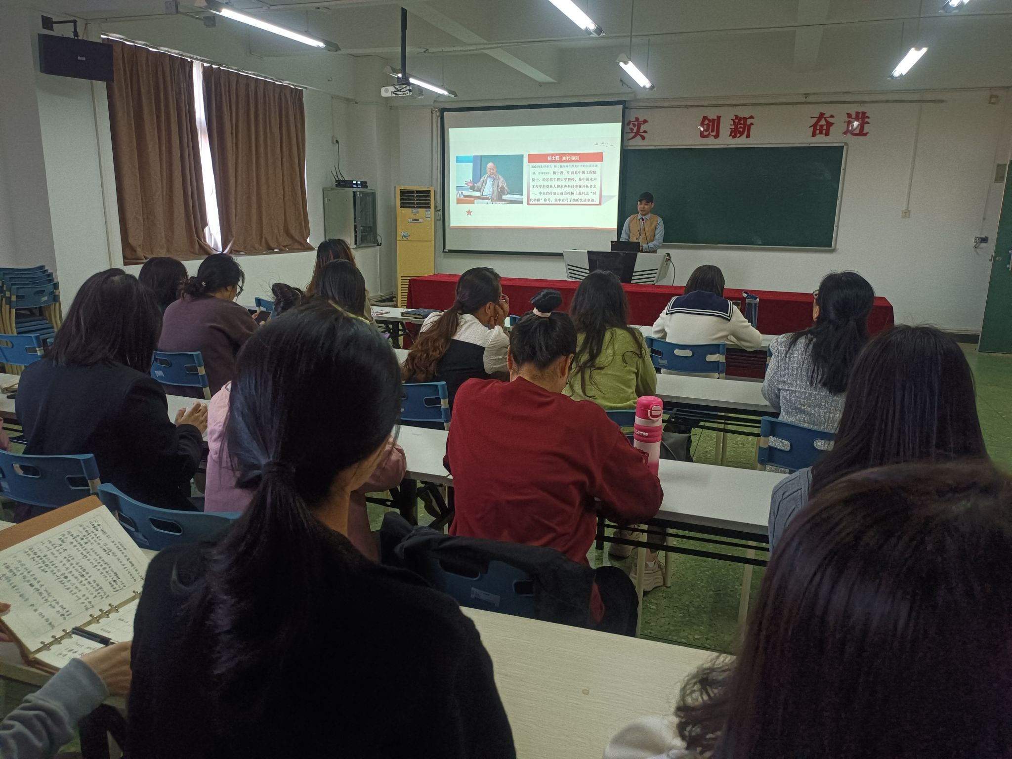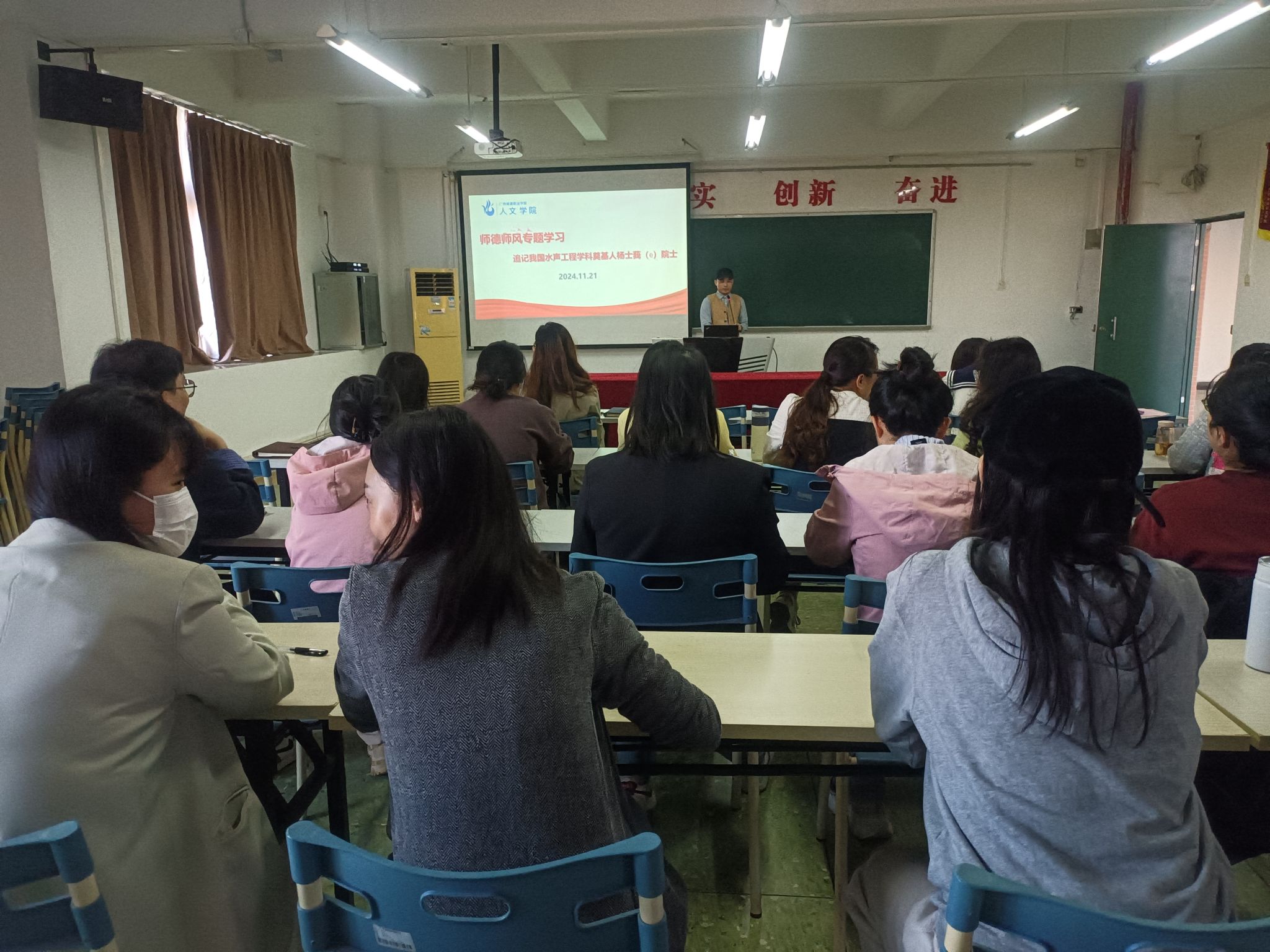 11月21日下午,公司在人文艺术楼513会议室开展师德师风建设专题活动之杨士莪教授先进事迹学习,公司全体教师党员教师、入党积极分子以及新入职教师共60余人参与了活动,活动由教师党支部宣传委员李锦洪老师主持。