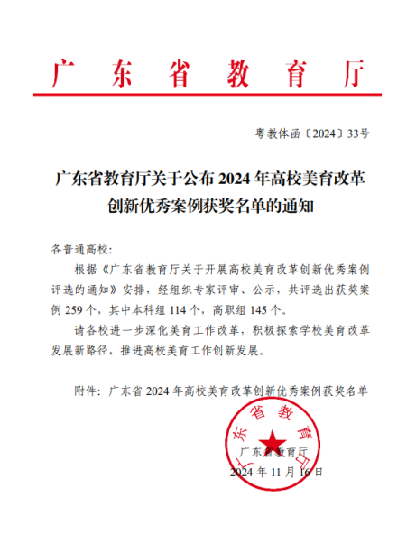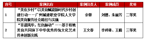 近日,由广东省教育厅举办的广东高校美育改革创新优秀案例评选获奖名单揭晓,全省本、专科公司共有259个案例上榜,公司余蓉、朱丽芳教师团队获高职组二等奖,王文春、李科锋、王婧教师团队获三等奖,这是公司教师参加全省高校美育改革创新优秀案例评选的一个突破。