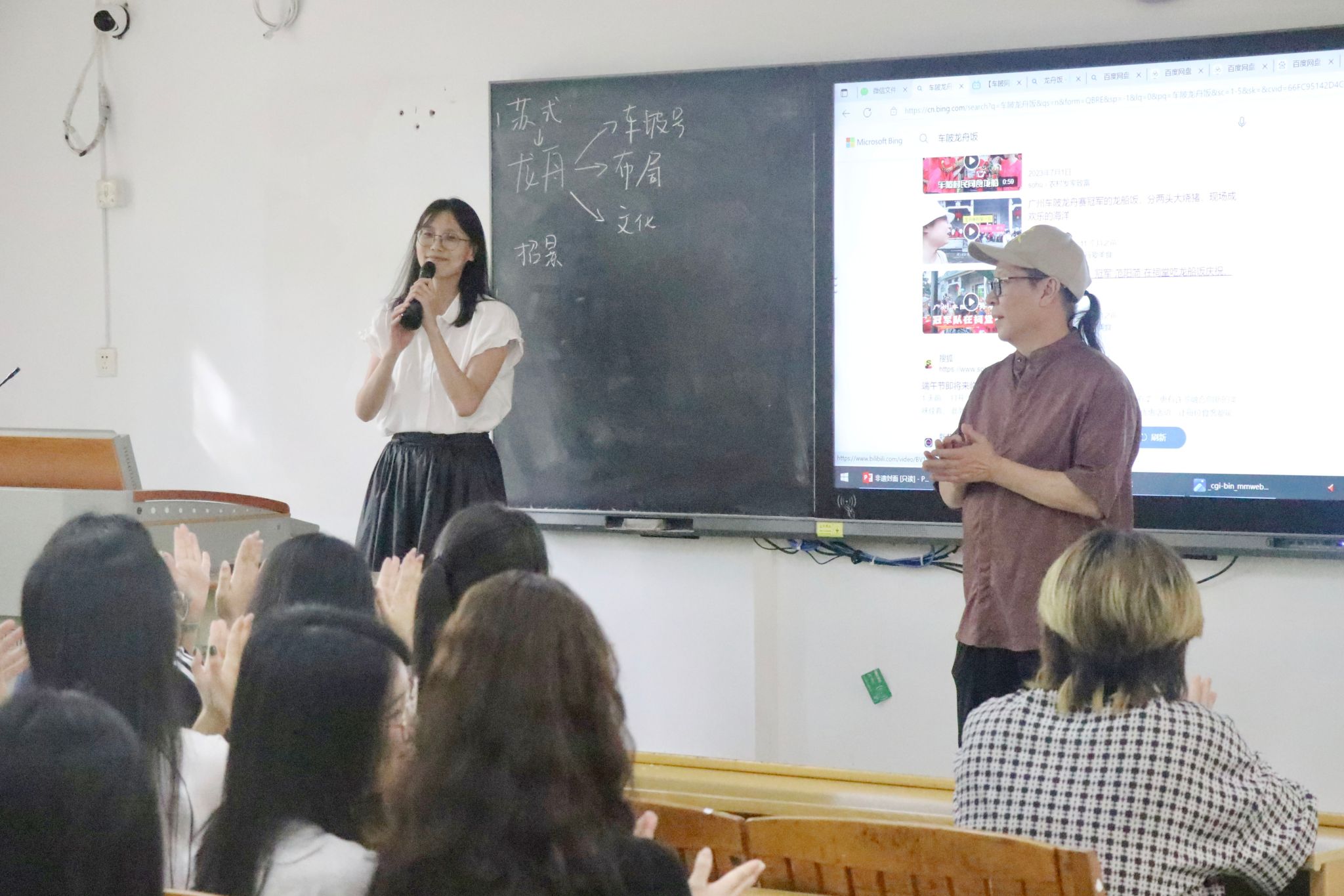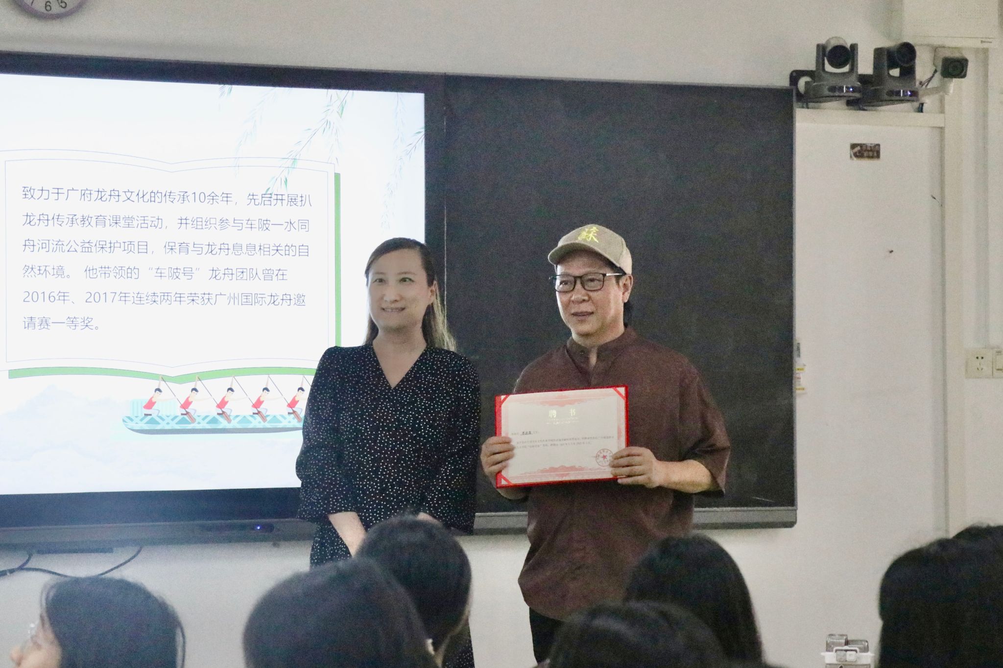 为深化课堂教学改革,将非遗文化融入课程思政课堂,提升教师授课质量,新媒体专业群教研部以《融合新闻采写》课程为基础举办了一场“非遗进课堂”主题特色教学活动,邀请了广州市龙舟非遗传承人苏应昌大师作为主讲嘉宾进行讲学,公司副经理王婧参与了课堂活动并为苏应昌颁发聘书,课堂由专业教师王境涵主持。