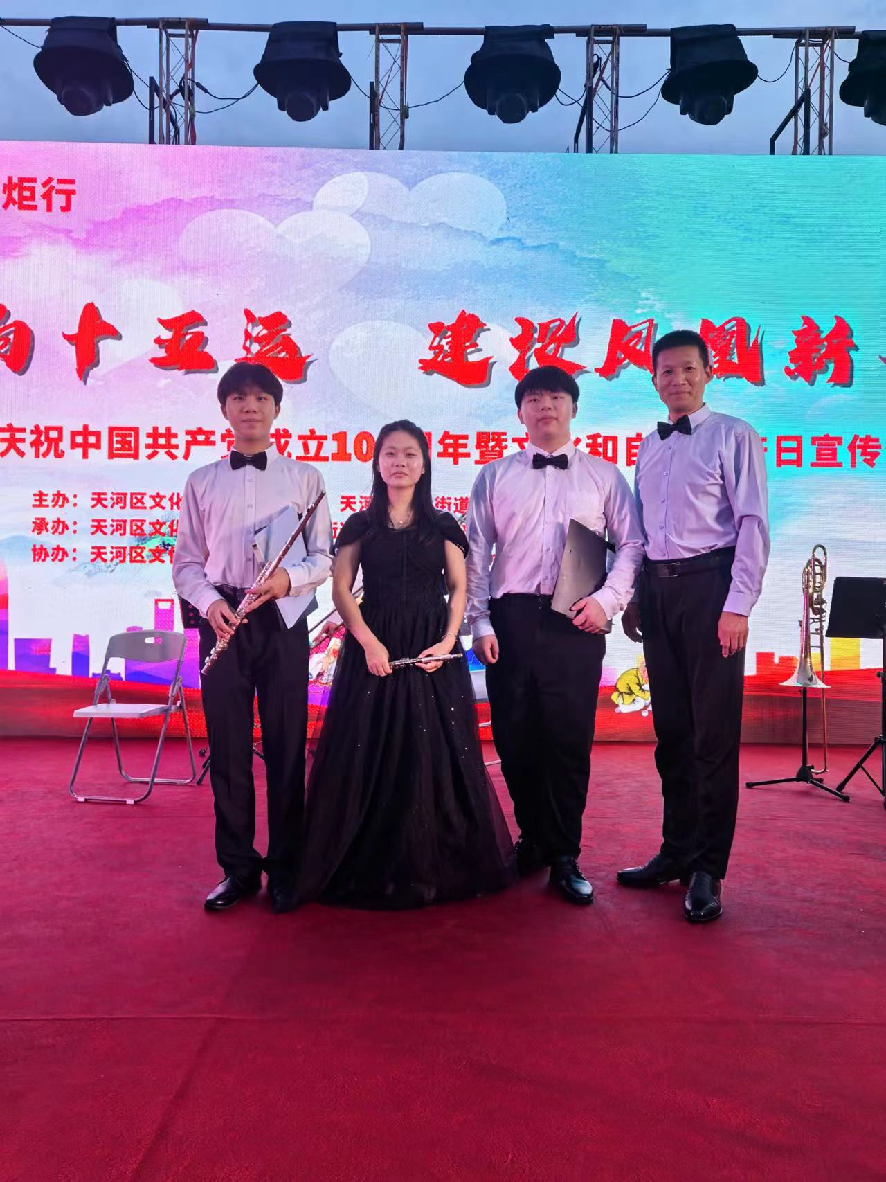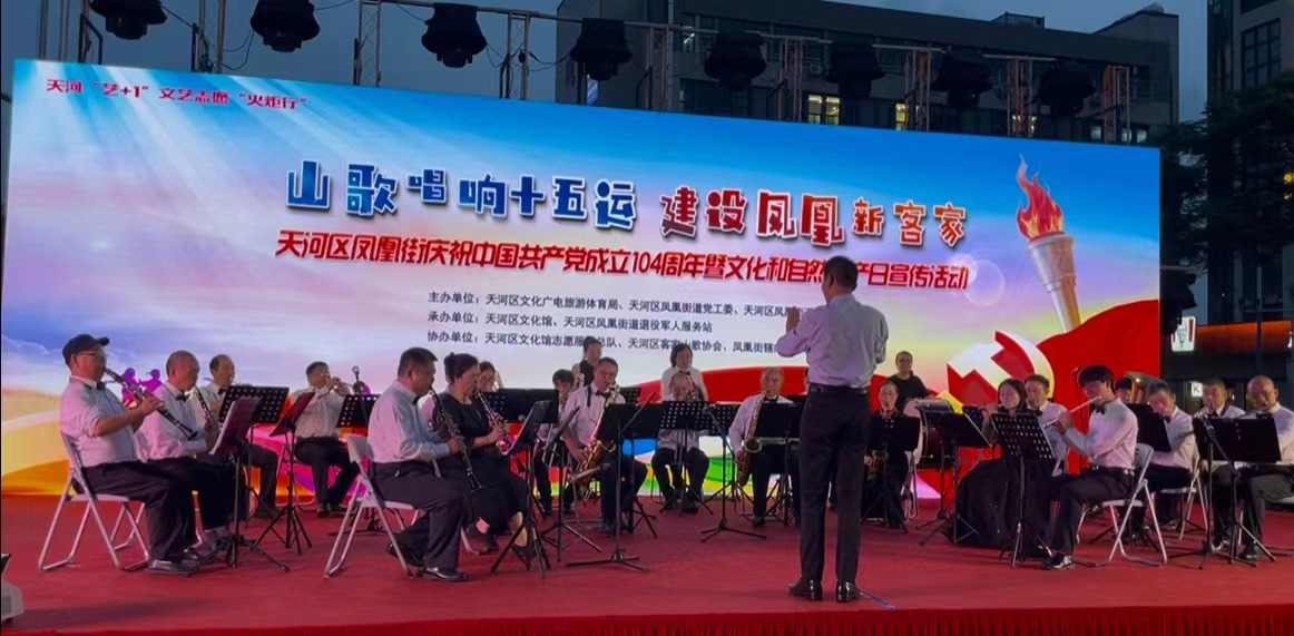 6月18日,天河区凤凰街举办“山歌唱响十五运,建设凤凰新客家”庆祝中国共产党成立104周年暨文化和自然遗产日宣传文艺演出活动。公司国家一级指挥家、音乐表演专业教师曾葵与林小青、凃玉栋、陈杰烽等3名员工应邀携手广州亚宇交响管乐团参与当天演出活动,向社会展示公司音乐表演专业办学实力。