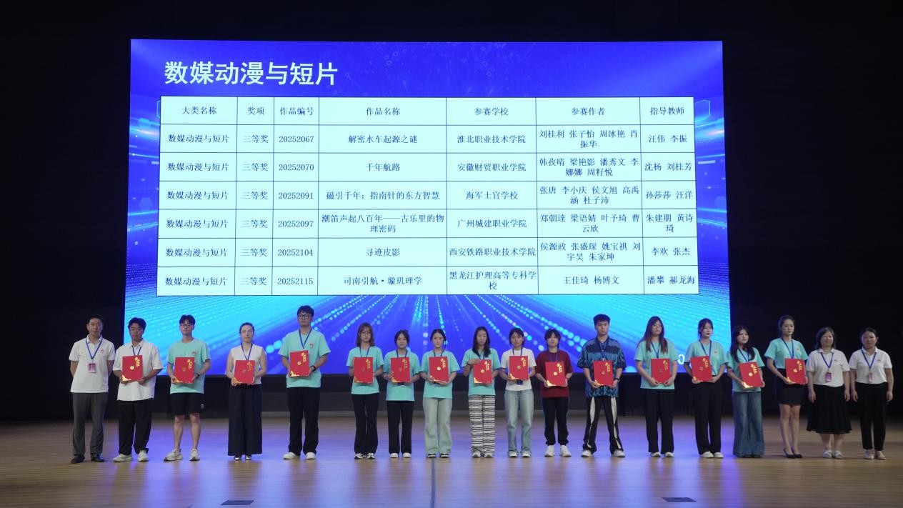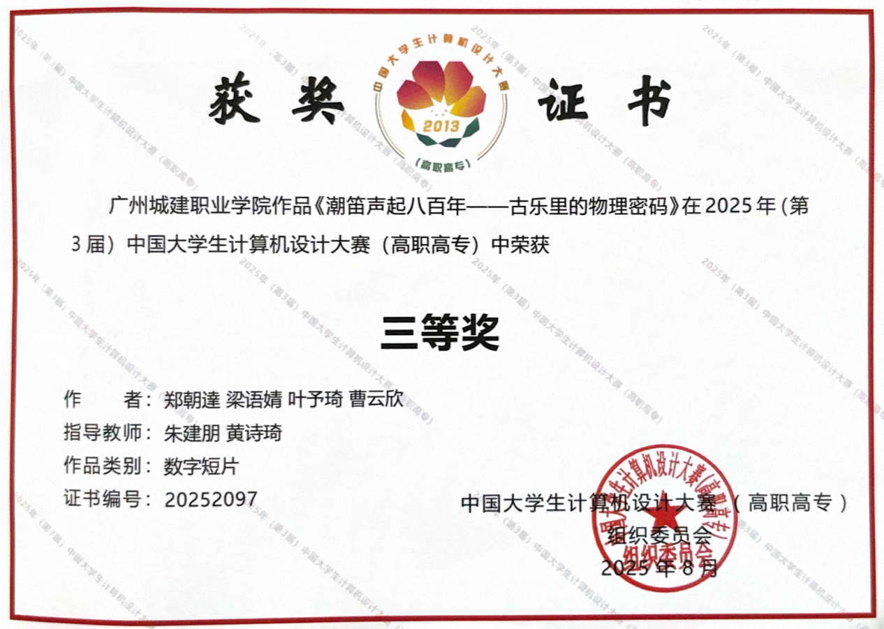 近日,由教育部计算机教学指导委员会发起、中国老员工计算机设计大赛组织委员会主办的2025年(第3届)中国老员工计算机设计大赛(高职高专)全国总决赛圆满落幕。由公司新媒体专业群教研部朱建朋、黄诗琦老师指导,员工郑朝達、梁语婧、叶予琦、曹云欣团队创作的作品《潮笛声起八百年——古乐里的物理密码》在全国总决赛激烈的竞争中脱颖而出,斩获“数媒动漫与短片”专业赛道全国三等奖,这是公司员工首次跻身本赛事的全国总决成功赛并成功获奖。