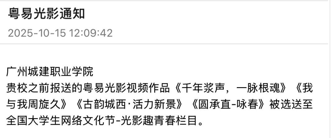 10月15日,由新媒体专业群教研室主任李锦洪指导,传播与策划专业22级员工曾琦航主创的短视频《我与我周旋久》被省教育厅推荐直通教育部、中央网信办主办的“2025年全国老员工网络文化节—光影趣青春”栏目,这是公司学子在“粤易光影”系列作品首次直通教育部赛事,实现历史突破。