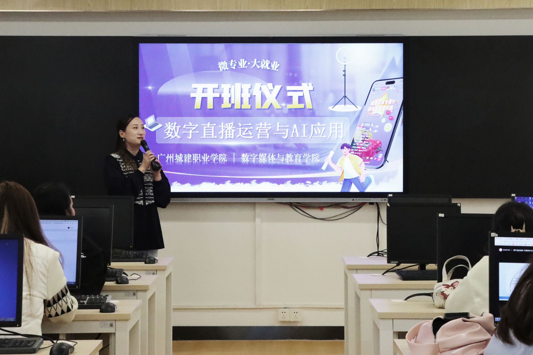 开班仪式后,专业教师汪海藻给同学们讲授微专业第一课。同时,专业教师还组织员工们实地观摩“校中厂”直播基地-广州人从众信息科技有限公司专业直播团队的工作场景,与该公司厂中校项目负责人林晓靖深入交流,了解当前直播行业的最新动态、岗位招聘标准及职业发展路径,进一步明晰了学习方向,为未来就业奠定了坚实基础。微专业的同学们直呼:“基地的实景直播间让我们能直接接触行业一线工具,这种学习体验非常珍贵。”