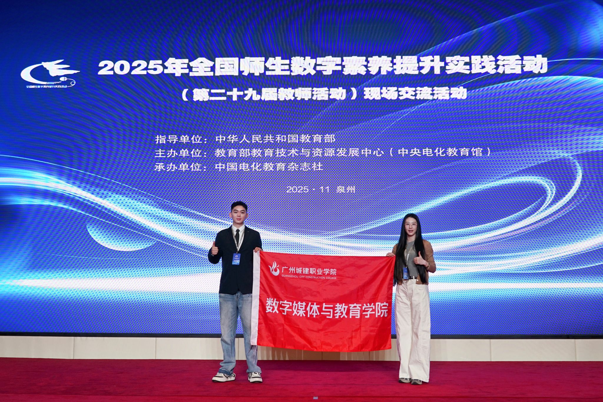 近日,由教育部指导、教育部教育技术与资源发展中心(中央电化教育馆)主办、中国电化教育杂志社承办的“2025年全国师生数字素养提升实践活动(第二十九届教师活动)”现场交流活动,于11月28日至12月1日在福建泉州顺利举办。公司新媒体教研部朱建朋团队、唐娑妮团队两支团队分别提交的作品《“丝路电商”直播场景搭建》、《数智化直播数据复盘》经层层遴选成功入围本次活动交流展示环节,是广东省唯一入选2个案例的公司。朱建朋、孙菲两位老师代表两支团队受邀现场参会交流,与全国各院校代表共话数字教育创新与实践。