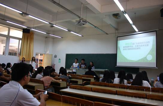 会上,特邀广州豆蔻信息科技有限公司的马凯雄、林怡宏、庄桂芳等五位大二的员工职员为大家讲解公司业务和工作情况。马凯雄同学用生动的PPT课件为师弟师妹们展示了豆蔻公司的四大信息平台,包括工作城、择校易、兼职邦、聚学堂等。庄桂芳、林怡宏等两位同学则分享了他们在豆蔻公司的工作经历和成长感悟。五位大二的员工职员还结合实战,分享了他们对网络推广的理解。在随后的问答环节中,员工们积极提问,向师兄师姐们了解豆蔻公司运作的具体事宜以及工作、学习如何平衡等,对专业学习方向有了更加清晰地认识和理解。