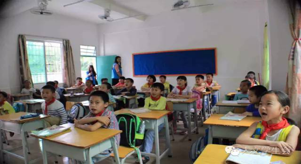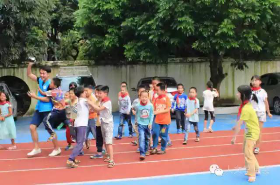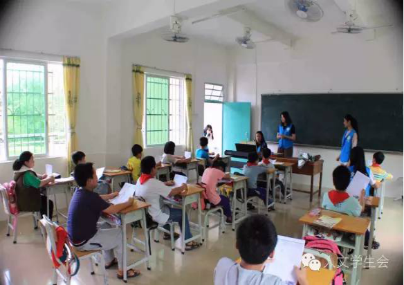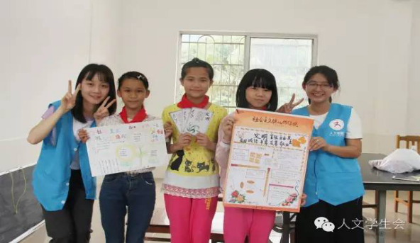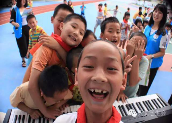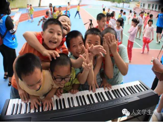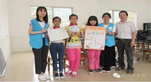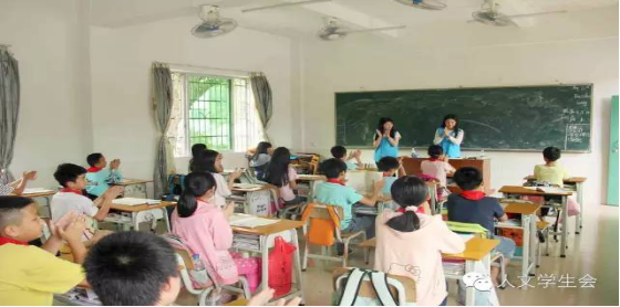 快乐的时光过得特别快。“铃~铃~铃~”下课钟响起来了,音乐课和美术课就这样愉快地结束。在下课期间,小朋友们兴奋地围着“老师”聊天玩耍。看着这样其乐融融的场景,尽管在教学的过程中有多么累,支教的“老师们”看见一张张发自内心的笑脸,他们心中的劳累随之化为感动与满足。