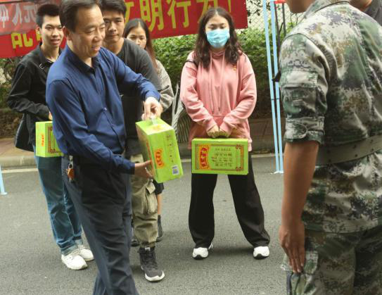 鲁岩经理来到人文公司军训大本营和各个方阵视察,对教官几天来的辛苦指导和训练表示感谢。当看到英姿飒爽的教官他亲切说到:“今年我们公司军训的人数再次创了新高,辛苦各位教官的辛勤付出,见到你们让我回想起在部队的那一段难忘而又自豪的经历,相信各位教官一定能带好新生,帮助他们成长成才”。在看到同学们端正笔挺地站里军姿,他给予高度的肯定,鼓励受训员工勇于吃苦,把在军训中养成的良好习惯和礼貌带到校园学习生活中去。鲁经理还为军训教官和辅导员老师送上慰问品,并叮嘱他们要科学训练,同时注意秋天保暖身体,在训练中投入饱满的热情,展现人文公司良好的精神风貌。