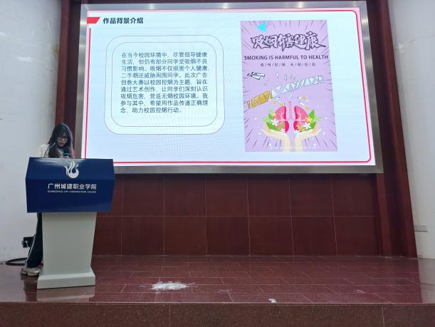 决赛现场,龙轩发表致辞,他说到,广告是智慧与艺术灵感的完美融合,而创意则是广告的灵魂。本次广告创意大赛结合公司创建无烟校园的倡导,为所有怀揣创意梦想的朋友们搭建的一个展示自我、交流合作的平台,鼓励大家用创意传递健康理念,为无烟校园建设贡献青春力量。在决赛环节,各参赛选手通过作品展示和创意解说,充分展现了自身的创新思维与专业实力。经过激烈角逐,24传策3班的刘美玲同学获得一等奖;23会计7班的邱焜英和23学前5班的郑慧莹获得二等奖;24学前实验班的邓可盈、23传策3班的黄秋冰、24学前实验班的吴舒娜获得三等奖。