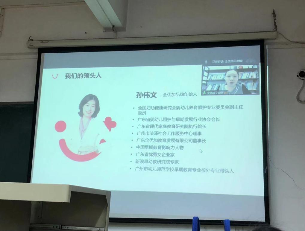 受疫情影响,本次讲座采取线上线下相结合的模式开展,让所有20级学前教育毕业生都参与其中。本次讲座邀请广东全优加家庭服务科技有限公司人事经理习海蓉女士给同学们带来《托育+早教专场》为主题的讲座。宣讲过程中,习经理谈到哈佛大学曾经做过一个调研,大概只有3%的人有清晰且长期的目标。在飞速变化的时代节奏下,一个目标被制定以后,可能受市场及环境因素的影响,目标也会发生一些变化。习经理借此告诉毕业生们,要至少在一两年内对自己的职业发展形成一个非常清晰的定位,这样的话可以避免少走弯路。与此同时,习经理还举出了职业定位的三大原则:择己所爱,择己所长,择市所需。借此强调毕业生们对教书育人的重视。讲座的最后,习经理向毕业生们介绍了全优加的品牌创始人—孙伟文女士,通过案例分享,让毕业生们也了解了全优加的企业文化,并对同学们提出的实习困惑进行了一一解答,希望同学们能树立良好的择业观,欢迎加入优秀的团队。