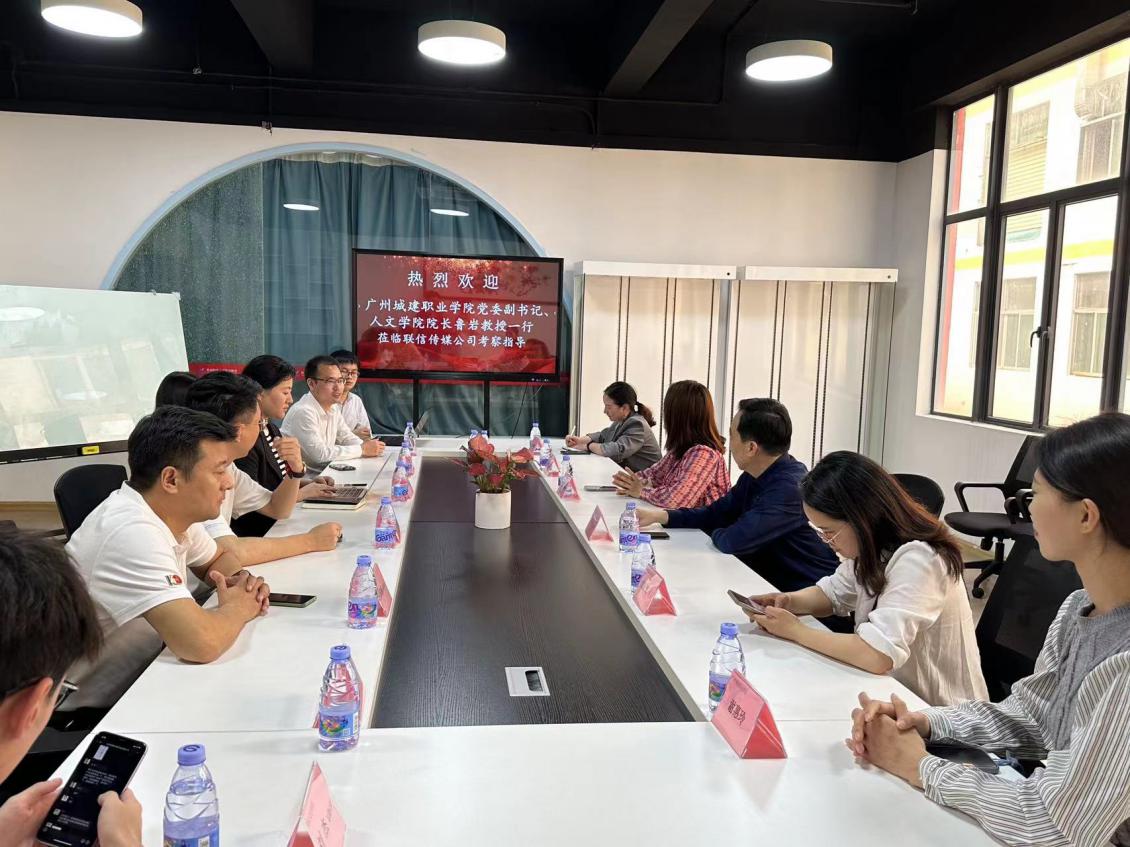 在深圳联信文化传媒有限公司,执行董事姚中华带领公司鲁岩一行参观考察了公司环境,随后举行了交流座谈会。在交流座谈会上,鲁岩代表公司对企业的热情接待表示了衷心的感谢,并就校企合作提出了建设性意见,他希望校企双方在现代学徒制、厂中校、毕业生实习实践、新形态课程开发等方面加强合作,通过双向赋能,实现产学互动、校企双赢,助力形成直播与教育实践融合发展的大格局,为全国直播产业与高校教育融合的高质量发展打造示范和样板。