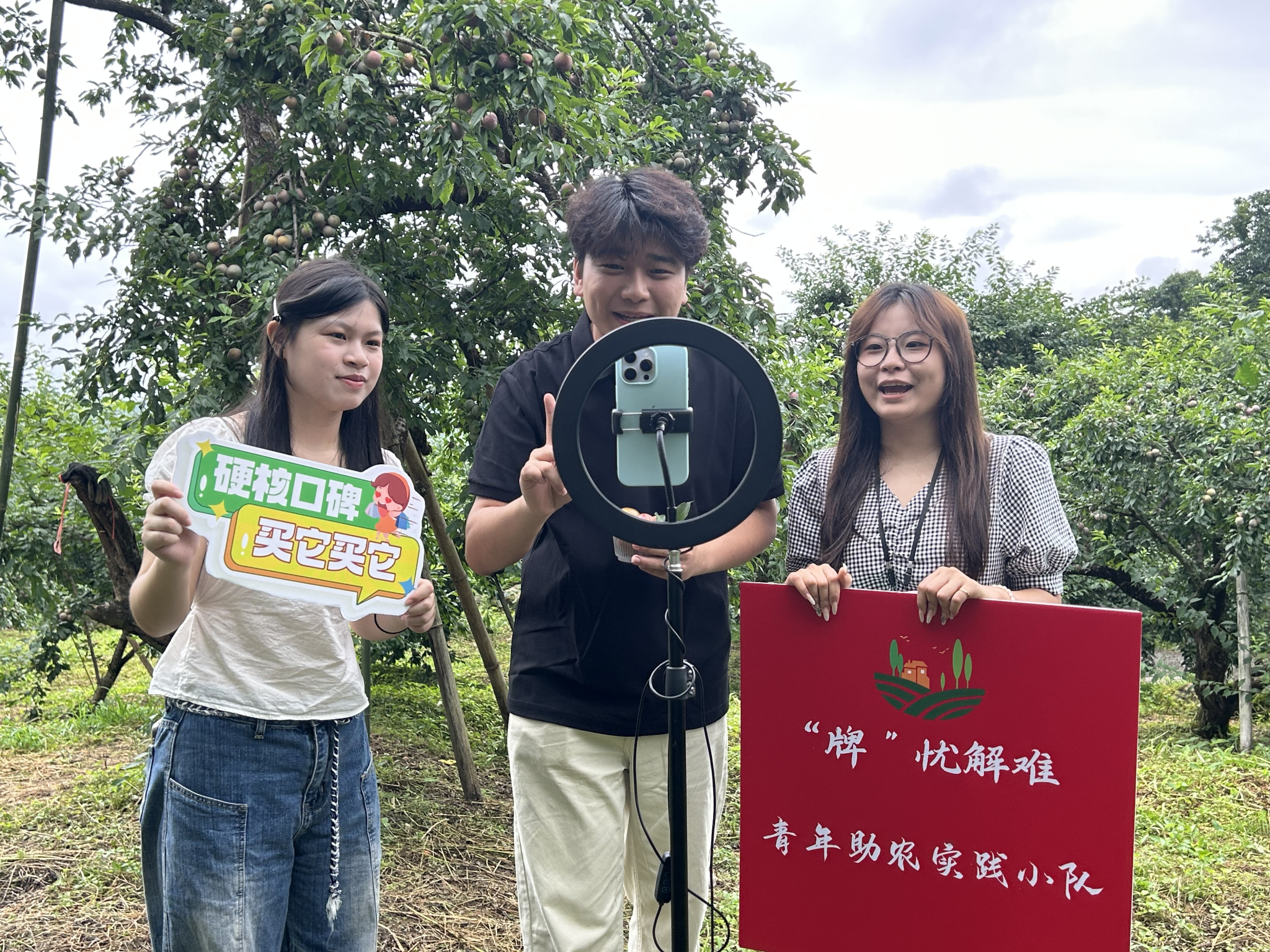 在实践过程中,团队运用自身专业优势,把实践课程行动力转化为田间生产力,将在公司中学习到的知识运用至桂峰村李子园的宣传实践中。“选李子要选土壤微量元素丰富、雨量充沛、四季温差不大的地方,桂峰村就有这样的优势,所以他们的李子是很甜的哦。想买的朋友们可以下单购买,我们这边直接现摘现卖。”该团队成员在直播中为广大网友介绍桂峰村李子的特点。