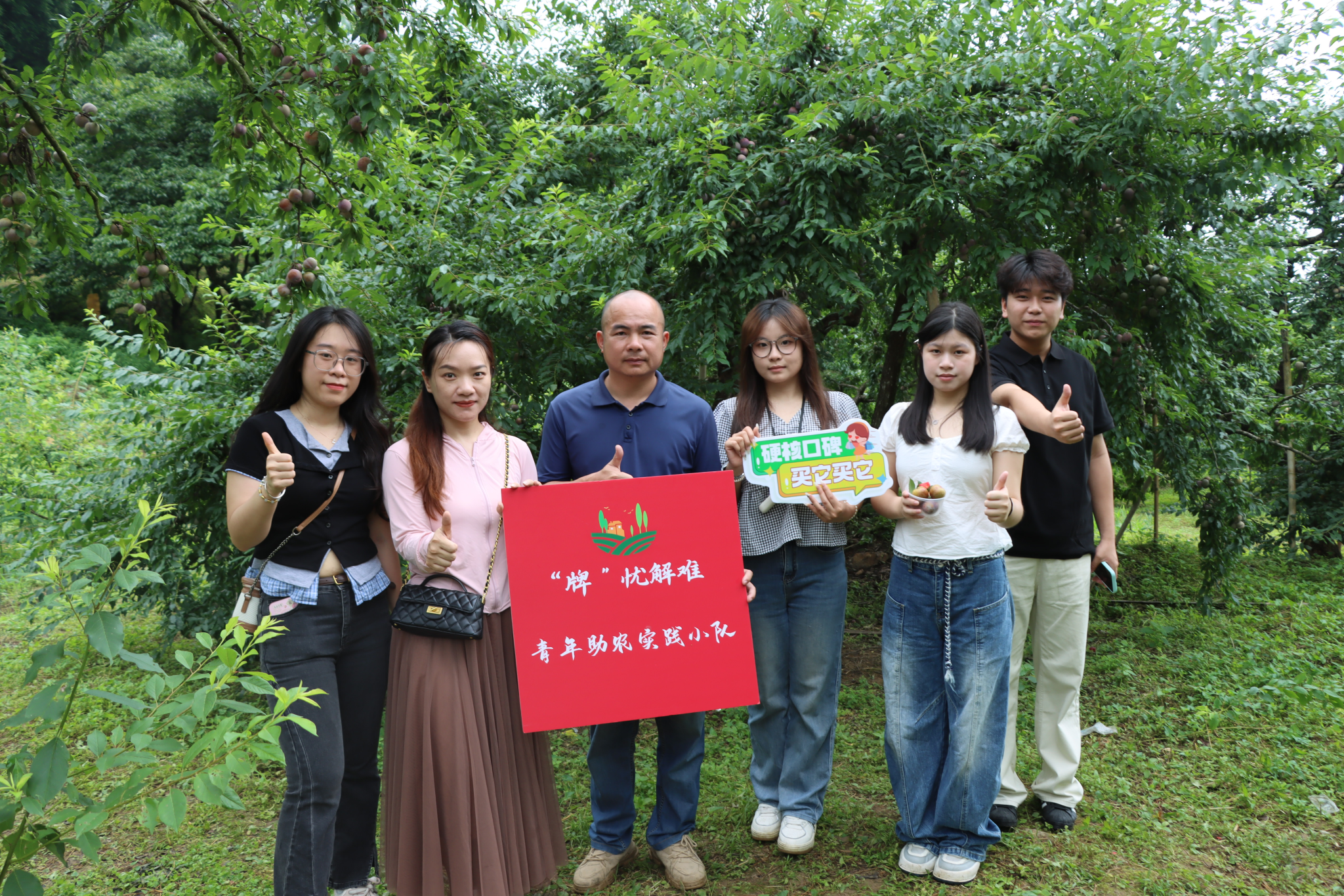 抵达当地后,团队首先与村委开展对接帮扶座谈会,桂峰村村委书记陈福财系统介绍桂峰村"党建引领+生态农业+民俗旅游"的特色产业体系。随后,在他的带领下,团队深入李子园田间地头,开展多维度调研。期间,团队向当地果农学习了李子生长特性与种植技术。针对桂峰村李子产业“有品无牌”的痛点,团队积极开展宣传视频拍摄、直播带货运营等实践活动,助力当地李子品牌塑造与产品推。