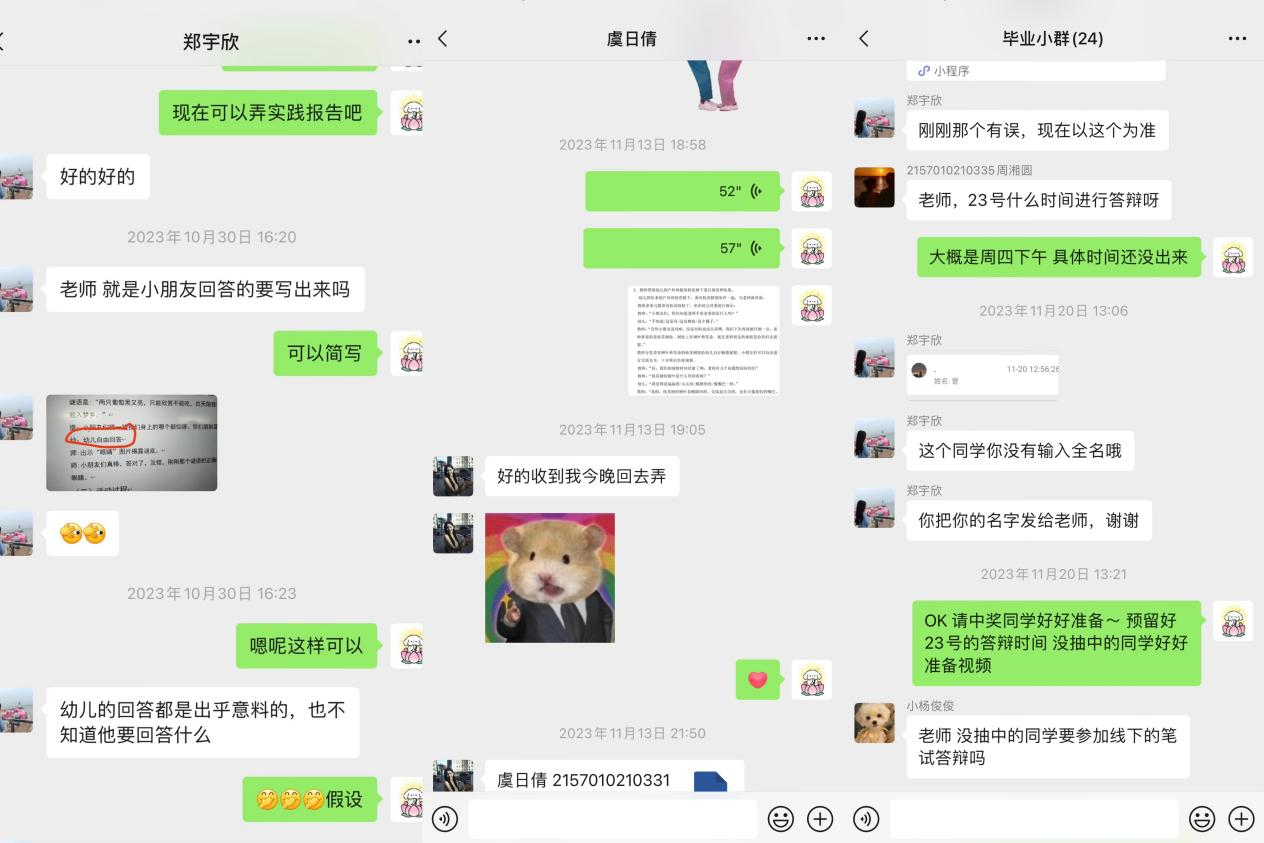在2024年毕业综合实践项目中,王喜贤老师指导了2021级学前教育的23名员工。从共同制定项目计划,再到明确研究目标和方法及内容,她都在鼓励员工从自己感兴趣的方向入手,查阅资料、发现问题、一起讨论解决问题的思路与方法,这一过程中严格按照公司的相关规定和公司的要求。在项目答辩及评阅阶段,王喜贤老师对每一位员工的项目都基于其特点和基础,给出了相对应的修改建议。其中采用了创设情境,和员工一问一答中,将理论与实践紧密联系,帮助员工更好的完成项目。